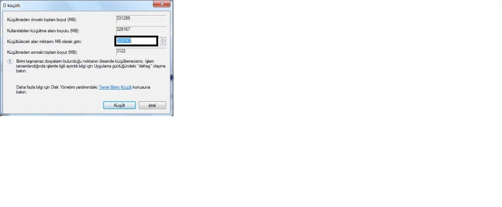 Küçültülecek alan miktarının MB olarak girin yazan yerine karşısındaki bölüme ne kadar alan ayırmak istiyorsanız o değeri giriyoruz ve alt kısımda küçült diyerek işlemi tamamlıyoruz.