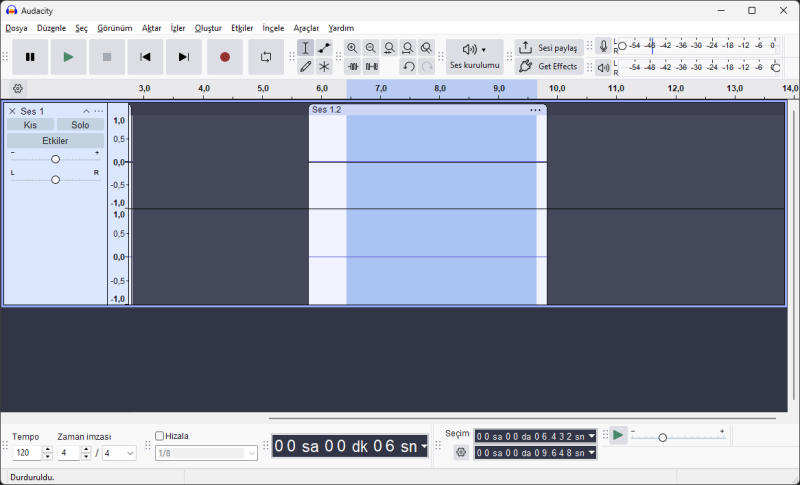 Kaydınız pencerede görünecektir. Seçim aracıyla bir bölümü seçebilir, üstteki araç çubuğundan ‘Kes’ (makas), ‘Kopyala’, ‘Yapıştır’ işlemlerini yapabilir veya ‘Efektler’ menüsünden basit efektler uygulayabilirsiniz. Gerçek zamanlı önizleme ile efekt sonucunu anında duyabilirsiniz.