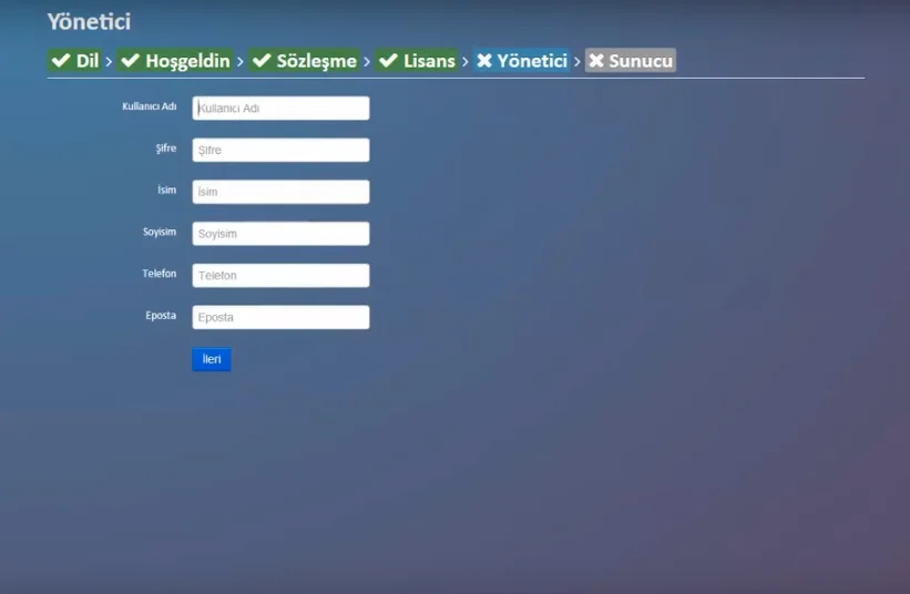 Yönetici bölümünde yönetici bilgileri yani kendi bilgilerimiz girip, “İleri” butonuna tıklayın.