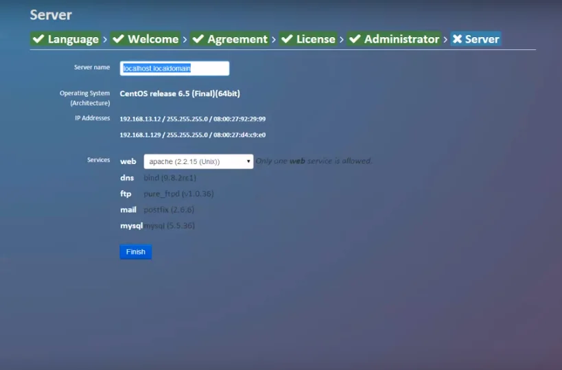 Son adımda ise sunucu ile ilgili işlemler yapılacak burada “Server Name” yazan yere sunucu adımızı yazıyoruz. Hemen alt kısımda “Services” bölümünde ise sucunun servisi “Apache” mi yoksa “Nignx” olacağını seçiyoruz. “Finish” butonuna tıklayıp kurulumu bitiriyoruz.
