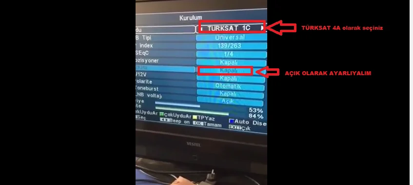 • Açılan kurulum ekranında, ‘Uydu’ kısmında ‘TÜRKSAT 4A’ seçeneğini seçelim. ‘Hz’ kısmı kapalı ise ‘Açık’ olarak ayarlayalım.