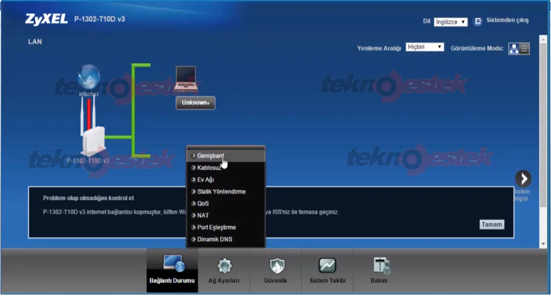 - Açılan sayfada Ağ Ayarları ⟶ Genişbant seçeneklerine tıklayarak ilerliyoruz.