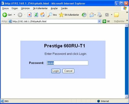 - Modem kurulumunu yapmak için öncelikle kablo bağlantılarımızı doğru bir şekilde yaptığımızdan emin olmamız gerekiyor. Daha sonra bilgisayardan bir internet tarayısıcı açarak adres çubuğuna 192.168.1.1 yazıp Enter‘a basıyoruz ve karşımıza gelecek olan ekranda Password bölümüne 1234 yazıp Login butonuna tıklıyoruz.