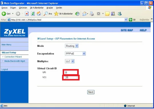 - Wizard Setup ekranı karşımıza çıktığında bu sayfada VPI : 8, VCI : 35 olarak düzenleyip Next butonuna tıklıyoruz.