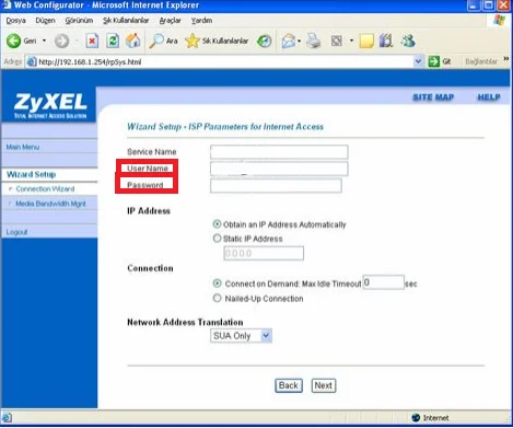 - Açılacak olan sayfada User Name ve Password kısmına servis sağlayıcınızdan almış olduğumuz kullanıcı adı ve şifremizi yazıp Next butonuna tıklıyoruz.