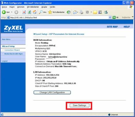 - Son adım olarak karşımıza çıkacak olan ekranda Save Settings butonuna tıklayıp kaydediyoruz ve modem kurulumumuzu tamamlıyoruz.